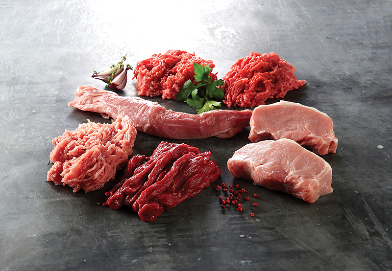 4 stk. løgsteaks 4 stk. karbonader 600 g hakket oksekød 600 g hakket skinkekød 800 g rørt fars